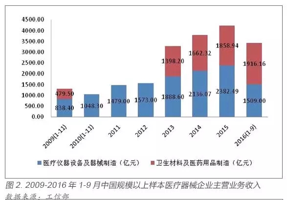 中国医疗器械市场规模从2001 年的179 亿元增长到2015 年的3080 亿元,年平均增长率在20% 左右。