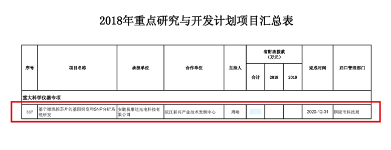 近期,由安徽易康达光电科技有限公司为承担单位,皖江新兴产业技术发展中心(中科院与安徽省共建的创新成果转化平台)作为项目合作单位联合申报的安徽省重点研究与开发计划项目“基于微流控芯片的基因突变和SNP分析系统研发”正式获批。