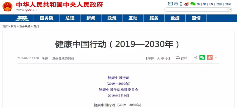 7月15日,国务院印发《国务院关于实施健康中国行动的意见》,国务院办公厅印发《健康中国行动组织实施和考核方案》,国家层面印发《健康中国行动(2019—2030年)》。这三个文件被统称为健康中国行动有关文件。