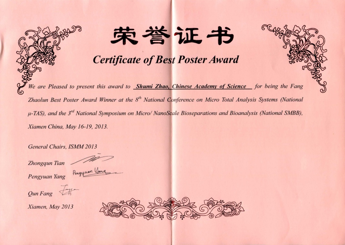 安光所光电子技术研究室刘勇研究员团队博士生赵树弥以《集成核酸提取实时荧光PCR微流控芯片研究》为题,就集成核酸提取实时荧光PCR微流控芯片技术及其应用研究方面的最新研究成果,向国内外专家做了详细的介绍,引起了广泛关注。 集成核酸提取的PCR微流控芯片,将核酸提取、PCR扩增与检测进行整合,可实现核酸检测过程的全自动与全封闭,不仅大大缩短了反应时间,简化了操作步骤,而且可消除目前PCR 过程可能存在的交叉污染,达到POCT 需求的“样品进—结果出”的目标。与会专家评委充分肯定了该研究的创新性,并确定授予“方肇伦优秀壁报奖”。值得一提的是本次参展壁报共220个,优秀壁报奖只设置3名。