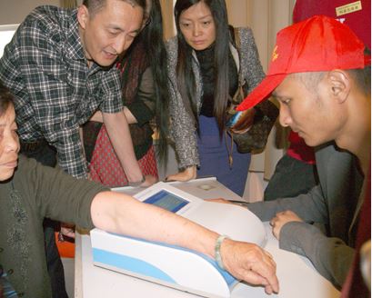为普及光学知识,安光所综合办为本次科技活动周积极筹备了两个新增项目:在光电子技术研究室的大力支持下,最新科研成果“皮肤AGE荧光光谱仪”进入光学展厅展出,该仪器可通过测量皮肤上的代谢产物了解人体的糖代谢状况;在科普和团委积极努力下,三名经验丰富的博士就光学知识准备了通俗易懂的科普报告,为前来参观的公众提供了一场丰盛的科普盛宴。“皮肤AGE荧光光谱仪”不负众望,成为光学展厅、甚至是合肥现代科技馆的新焦点,展位前人头攒动、热闹非凡,操作这台仪器的两名志愿者——侯华毅和马忠杰,基本上就没有歇下来的机会,一直为热情高涨的公众检测糖代谢情况,2天之内接待了400左右人次。据侯华毅介绍,前来检测的公众大多数糖代谢情况还是很良好的,但少数年轻人由于养成了糖摄入过量、缺乏运动、睡眠不足、抽烟等不良的生活习惯,虽则年轻测试数据却已接近临界值。