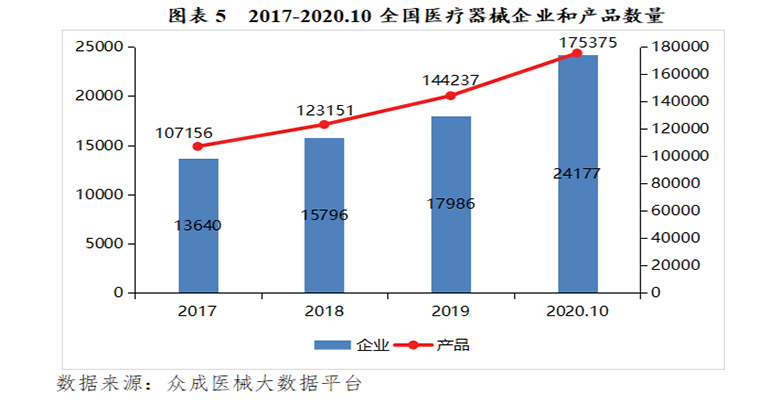 2017-2020年,中国医疗器械企业与产品数量呈逐年攀升趋势。截至2020年10月底,全国共有医疗器械生产企业24177家,较2019年底增长34.42%,经营企业数量规模已达694191家。其中,高新技术企业3672家,科技型中小企业3152家;境内上市企业78家,新三板挂牌企业257家。