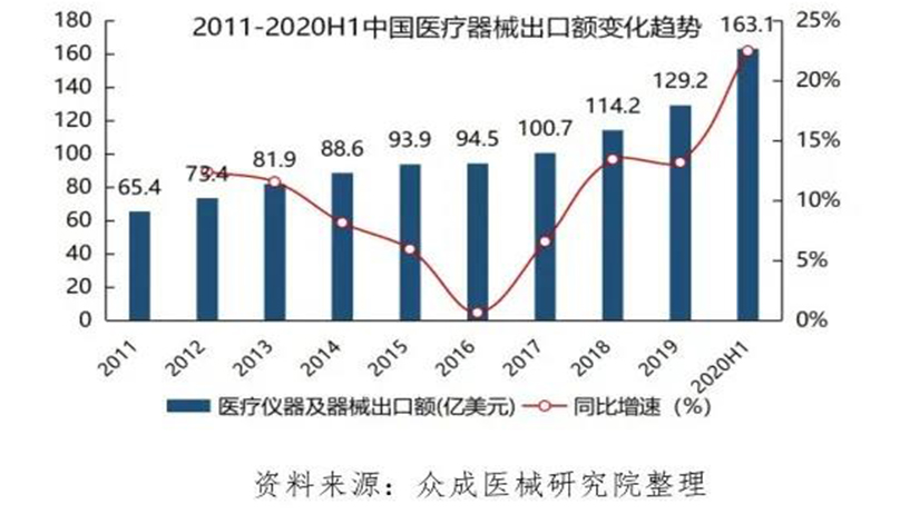 据海关统计,2011-2019年,我国医疗器械的出口额逐年增长,年复合增长率达9.32%。2020年上半年我国医疗器械出口额达163.13亿美元,同比增长22.46%。