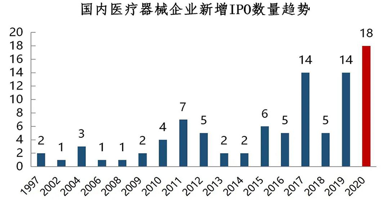 随着科创板开板和注册证改革,医疗器械成为资本市场焦点,同时也成为科创板上市数量最多的细分领域。2018年证监会发布《关于开展创新企业境内发行股票或存托凭证试点的若干意见》,依法创造条件引导生物医药等领域创新企业发行股权类融资工具并在境内上市。