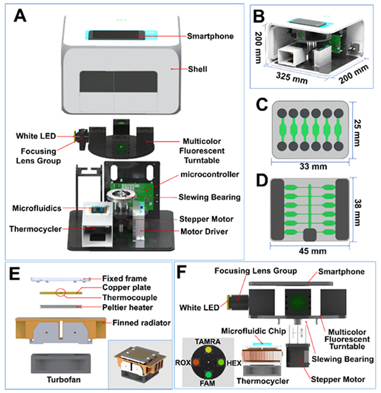 MS2设备:(A)结构图 (B)外形尺寸图 (C)PCR芯片 (D)等温芯片 (E)热循环仪 (F)多色荧光检测模块