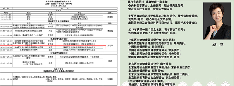 会议期间,12月18日下午16:10—16:30,在“健康管理与医体融合”分论坛,首都医科大学宣武医院健康管理中心主任褚熙教授将分享题为“健康管理中心糖尿病早期筛查与干预”的学术报告!欢迎健康服务业和健康管理专业的专家、学者通过线上线下等方式聆听交流。