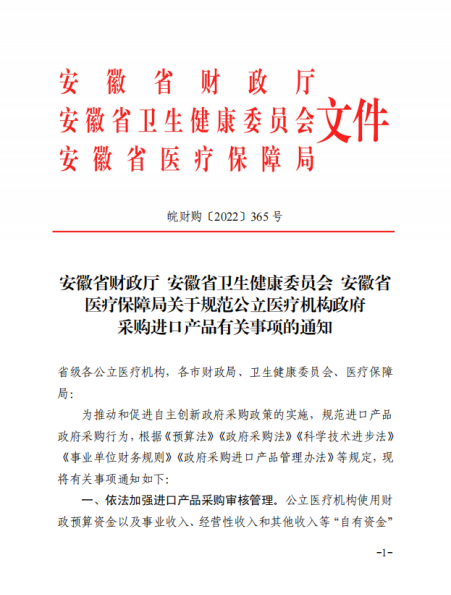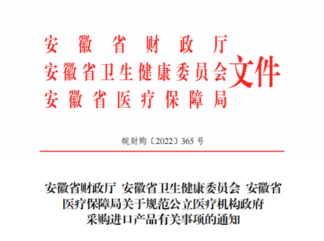 近日,安徽省财政厅、安徽省卫健委、安徽省医保局联合发布了《关于规范公立医疗机构政府采购进口产品有关事项的通知》。