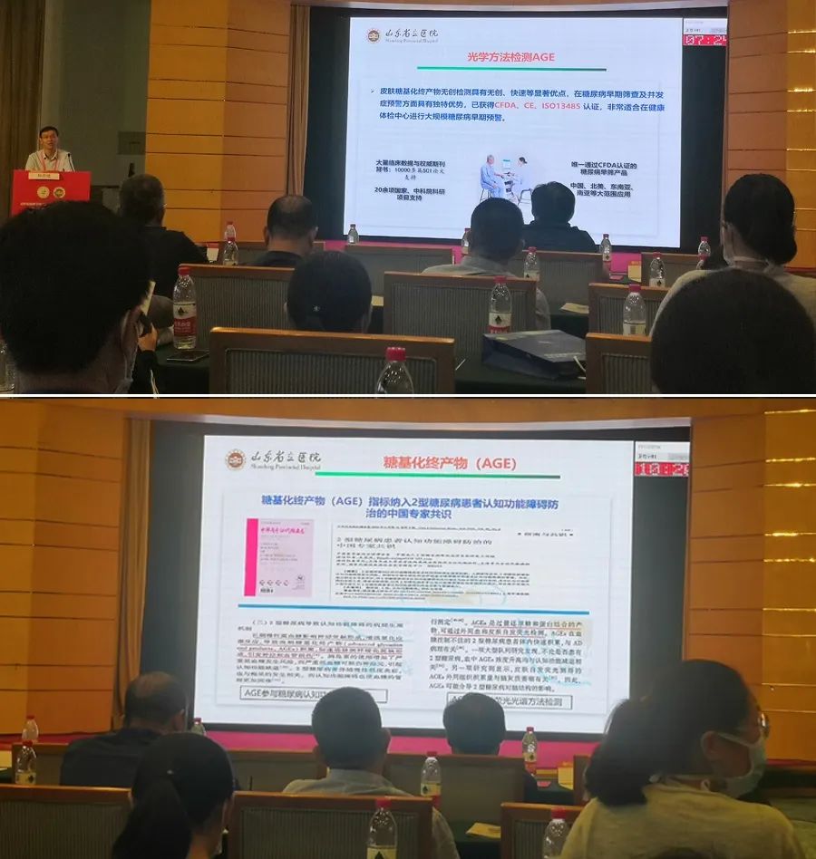 8月12日,在济南举办 “山东省健康管理专科联盟第二次学术会议”上,山东省立医院副院长孙志坚教授在“糖尿病早期无创光学检测技术及其临床应用”学术报告中,系统的介绍了糖基化终产物(AGE)指标以及AGE与糖尿病的关联性,阐明通过光学方法无创检测皮肤AGE蓄积量可用于糖尿病早期预警的原理及科学性,并且进一步指出AGE指标在糖尿病并发症评估中同样具有重要的临床价值。