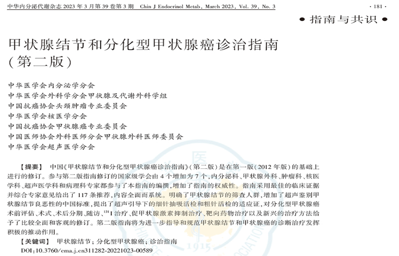 2012年,我国首部甲状腺结节和分化型甲状腺癌指南(《甲状腺结节和分化型甲状腺癌诊治指南》)的制定,为我国国民的甲状腺健康事业作出了重要贡献。现如今,已过去10年,我国甲状腺癌发病率显著增加,尽管恶性程度较低,但是仍然威胁患者的生命健康及生活质量,为顺应本领域的学术进展和相关临床需求,中华医学会内分泌学分会、中华医学会外科学分会甲状腺及代谢外科学组、中国抗癌协会头颈肿瘤专业委员会、中华医学会核医学分会、中国抗癌协会甲状腺癌专业委员会、中国医师协会外科医师分会甲状腺外科医师委员会和中华医学会超声医学分会等7个权威学会,历时1年时间定稿,并于近期发布了《甲状腺结节和分化型甲状腺癌诊治指南》(第二版)。