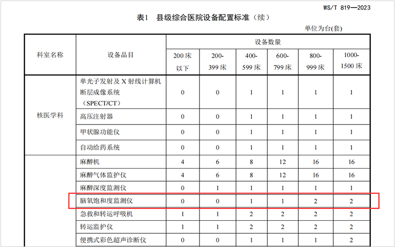 文件指出,县级综合医院应在明确功能定位的基础上,科学合理配置与自身规模和服务量相适应的设备品目及数量。其中,脑氧饱和度监测仪列入麻醉科设备配置标准。