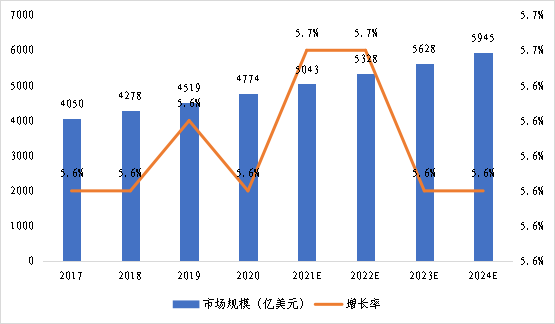 2020年全球医疗器械行业市场规模为4774亿美元,同比增长5.6%,预计到2024年底全球医疗器械行业规模将达接近6000亿美元,2017-2024年复合增长率为5.6%,行业有望保持稳定增长。