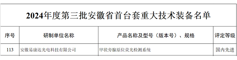 为贯彻落实党中央、国务院关于支持自主创新的要求,促进首台套重大技术装备、首批次新材料和首版次软件的研发应用,安徽省工业和信息化厅开展了2024年度第三批首台套重大技术装备申报评定工作,经过多轮评审,我公司PTS-500型甲状旁腺检测仪成功入选了安徽省首台套重大技术装备名单(2024第三批)。