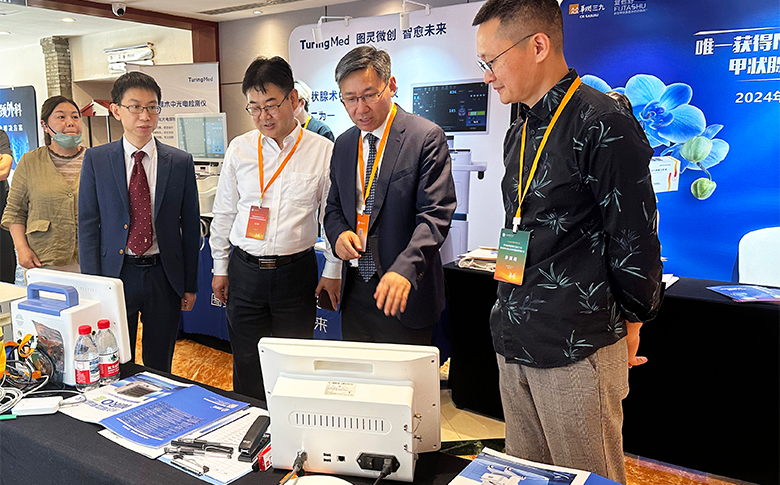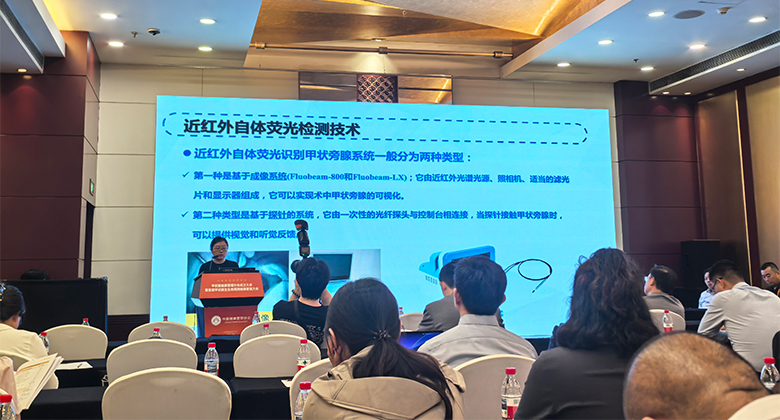 在学术交流环节,来自首都医科大学附属北京儿童医院刘悄吟教授分享了题为“基于语音播报的近红外自体荧光技术在术中甲状旁腺识别中的应用”学术报告,系统阐述了甲状旁腺检测仪检测原理及临床应用,吸引了众多参会专家的目光,为解决甲状腺手术中甲状旁腺的快速识别这一临床难题带来了新曙光。由易康达医疗研发的甲状旁腺检测仪基于近红外光荧光原理,在785nm 的激发波长下,甲状旁腺组织会发出820-830nm的荧光,其强度可达周围正常组织的2-12倍,能够实现手术过程中对甲状旁腺的实时精准识别。同时,设备具有环境光校正和自动降噪功能,有效保障了在各种复杂手术环境下检测结果的准确性与稳定性。凭借其先进的技术和卓越的性能,该检测技术已获得《术后甲状旁腺功能减退症管理专家共识》等权威指南推荐,并成功入围2024年度第三批安徽省首台套重大技术装备名单。