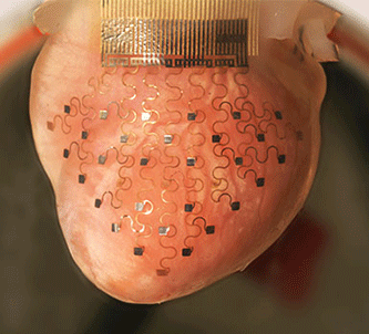 伊利诺伊大学教授约翰·罗格斯(John Rogers)联合华盛顿大学的一支研究团队开发出了一款柔性套环,能够包裹在一颗跳动的兔子心脏的外部,以3D形式监测其电活动。在不久的将来,该技术可能被用于高精确感知和响应心律失常。