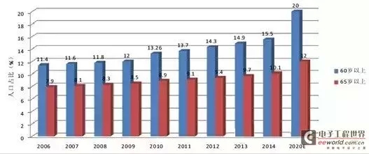 据国家统计局2014年国民经济和社会发展统计公报显示,2014年年末我国60周岁及以上人口数为21242万人,占总人口比重为15.5%;65周岁及以上人口数为13755万人,占比10.1%,首次突破10%。我国已步入老龄化社会(当一个国家或地区60岁以上老年人口占人口总数的10%,或65岁以上老年人口占人口总数的7%,即意味着这个国家或地区的人口处于老龄化社会),且趋势仍在加剧,预计2025年我国60岁以上的人口将超过3亿。