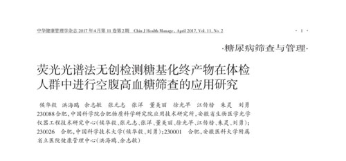 近期,安徽省立医院洪海鸥主任等作者的最新研究成果“荧光光谱法无创检测糖基化终产物在体检人群中进行空腹高血糖筛查的应用研究”,经过同行专家评议,被国内健康管理领域顶级期刊《中华健康管理学杂志》正式收录并将发表于2017年4月。该研究显示DM Scan筛查血糖异常具有较高的敏感性和特异性,ROC曲线下面积为0.836,Logistic回归分析显示AGE值是血糖异常发生的独立危险因素,结果表明无创检测糖基化终产物在大规模体检人群中进行血糖异常筛查具有重要的应用价值。本研究获得了国家科技支撑计划(2015BAI01B04)、国家中医临床研究基地业务建设专项课题(2015D05)、STS项目(KFJ-SW-STS-161)、安徽省科技重大专项计划项目(15czz02019)等项目的支持。