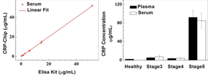为解决这一问题,我们研制了一款基于纸基微流控芯片和智能手机的慢性肾病生物标志物检测装置,该装置能够实现多种标志物的同时检测,能够有效提高早期诊断的准确性,为治疗方案的确定提供更有价值的信息。在单个芯片上,15分钟能够完成三组测试,检测成本小于50美分,测量结果与传统的ELISA相比具有很好的一致性。通过对人体血清/血浆标志的检测,实现了健康人和慢性肾病病人的区分。