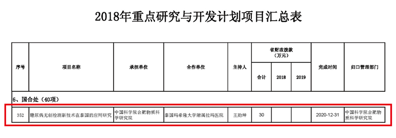 近期,由合肥物质科学研究院牵头,泰国玛希隆大学附属拉玛医院作为项目合作单位联合申报的安徽省重点研究与开发计划项目“糖尿病无创检测新技术在泰国的应用研究”已正式获批。