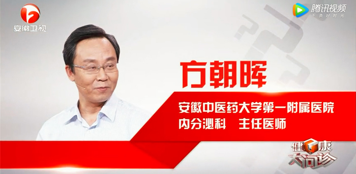 2018年10月23日,安徽卫视健康养生类节目《健康大问诊》如期播出,本期话题是“危机四伏的糖尿病”,应邀嘉宾是来自安徽中医药大学第一附属医院内分泌科的方朝晖教授(医学博士,教授,安徽省首届“江淮名医”,合肥市拔尖人才,享受政府津贴。国家中医临床研究基地重点研究病种——糖尿病学术带头人;国家中医药管理局重点学科——中医内分泌学学科带头人;国家中医药防治糖尿病联盟副主任委员。主持国家级课题8项,发表专业学术论文236篇,主编专著12部,获得国家发明专利12项),主要围绕糖尿病并发症的风险评估及其防治普及健康养生之道。