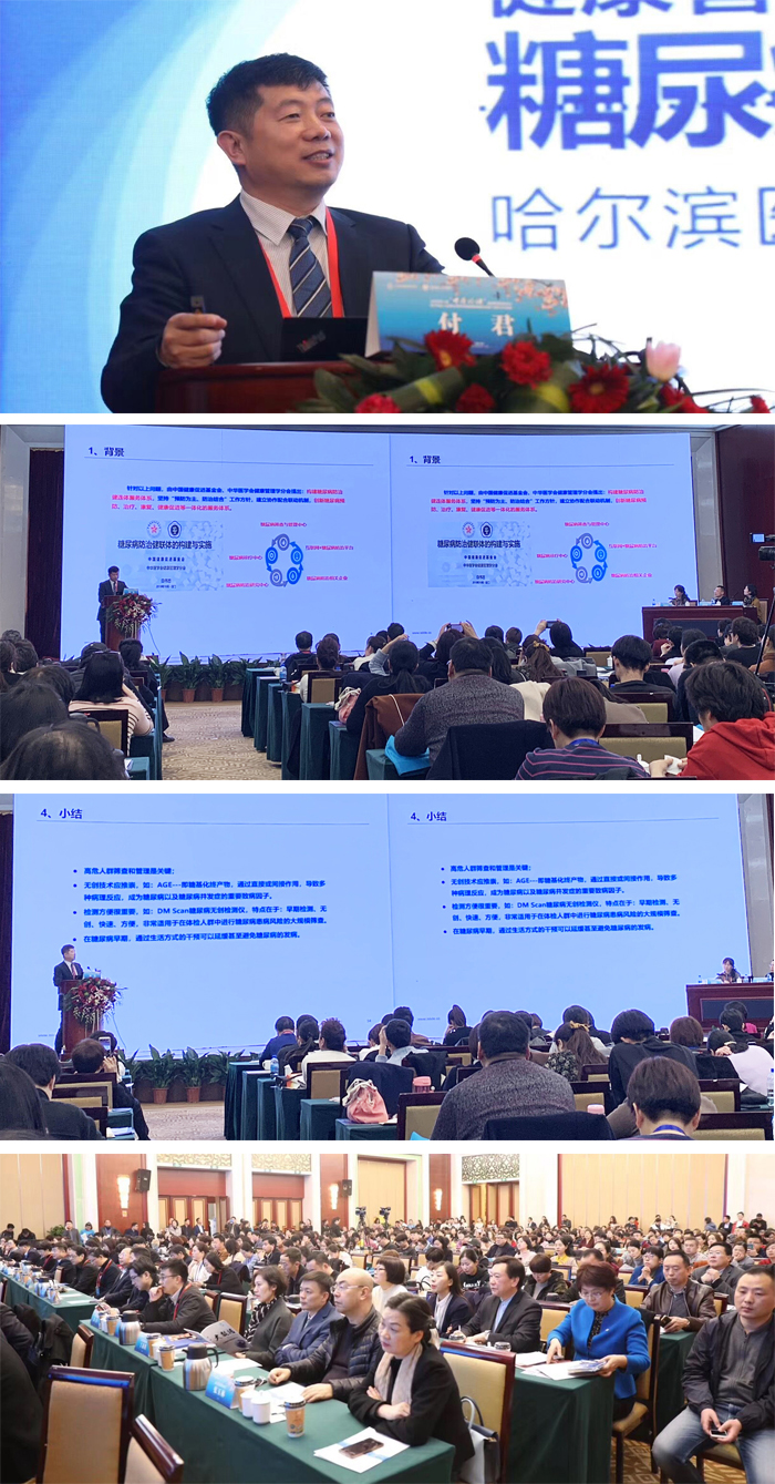 会议期间,哈尔滨医科大学附属第一医院体检会诊中心主任、体检与健康评估学组组长付君教授做了主题为“糖尿病在健康管理中心筛查路径、指南及管理”的报告,报告从“糖尿病的流行现状”、“糖尿病筛查传统方法”、“糖基化终产物(AGE)与糖尿病的关系”、“糖基化终产物(AGE)筛查糖尿病临床应用研究”等方面对糖尿病无创检测仪(DM Scan)及其临床应用进行了专题报告、交流。付君教授指出,糖基化终产物(AGE)是糖尿病重要的致病因子,利用光学的方法实现对AGE的检测,具有无创、快速、准确等优势。付君教授也分享了糖尿病无创检测仪(DM Scan)在全国多中心的临床应用研究结果,结果证明,通过对糖基化终产物的检测,可准确、快速筛查糖尿病及糖耐量减低人群,为健康管理中心筛查糖尿病或糖耐量减低人群提供了新的方法,具有较好的社会效益和经济效益。