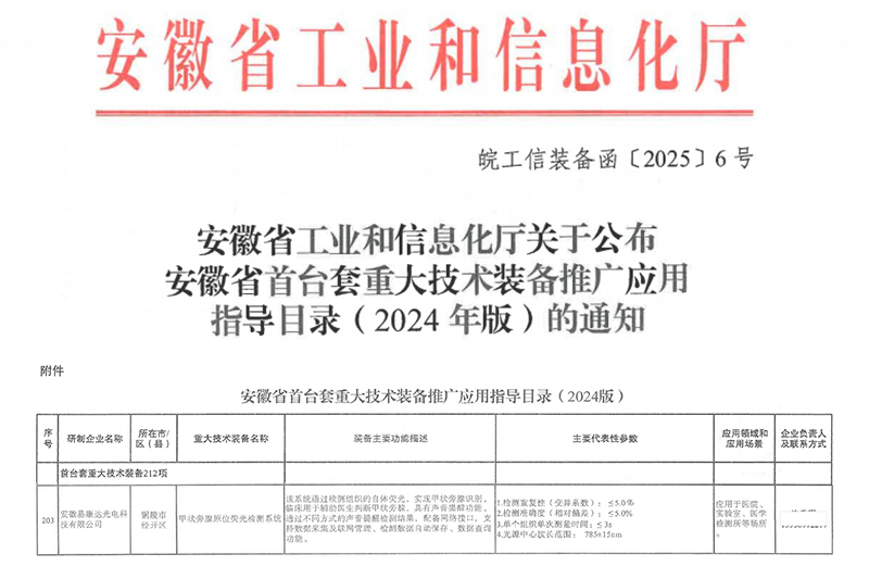 近期,为贯彻落实安徽省政府关于支持自主创新的要求,促进我省重大技术装备产业高质量发展,鼓励在重大工程、数字化转型等重大项目和有关政府采购中优先选用创新产品,安徽省工业和信息化厅编制了安徽省首台套重大技术装备推广应用指导目录(2024年版),经过多轮遴选,我公司PTS-500型甲状旁腺检测仪成功入选该指导目录(公示信息如下图所示)。
