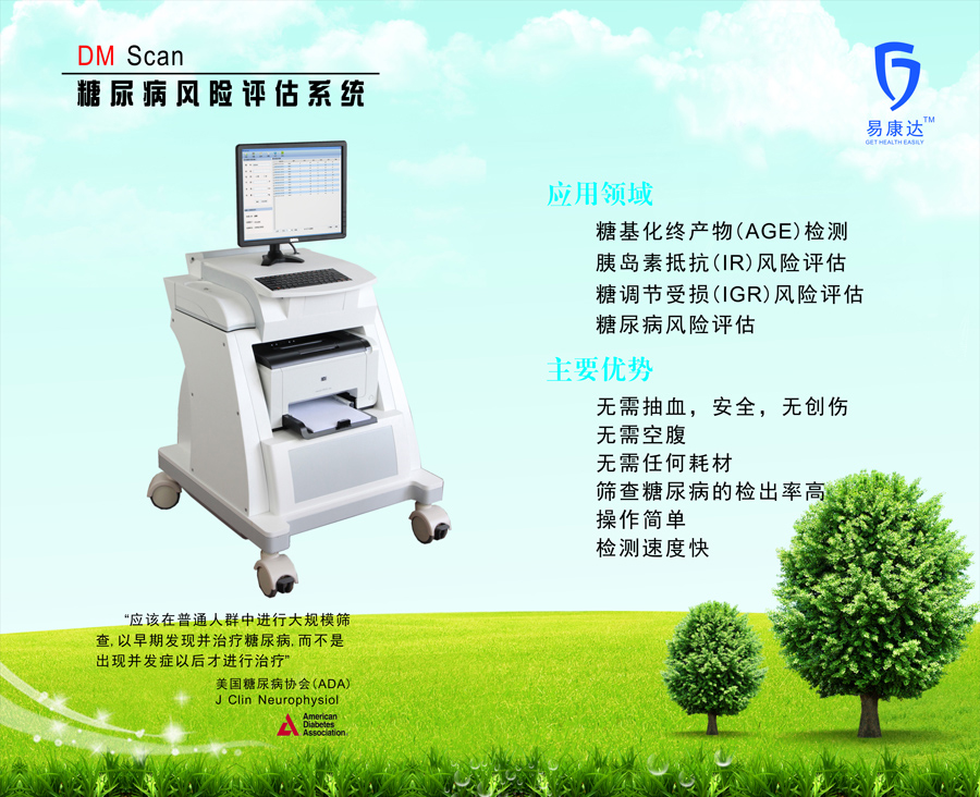 多项研究调查显示我国可能已成为世界上糖尿病患病人数最多的国家,患病率约为9.7%。糖尿病给患病个体带来了肉体和精神上的损害,同样给国家带来了沉重的经济负担。前瞻性试验发现早点筛查出糖尿病及糖尿病前期或糖尿病高风险人群对于糖尿病的预防和治疗能起到重要作用!目前临床上常用血糖指标判断糖尿病,敏感性低,漏检率高。而我公司产品在筛查糖尿病方面敏感性高,与空腹血糖法相比,漏诊率更低,会有更多的糖尿病前期或糖尿病病人及糖尿病高危人群被检出,这有助于糖尿病的早期发现,从而降低患糖尿病并发症的风险,加之该方法具有无创、快速的优点,将为治疗糖尿病做出重大贡献!